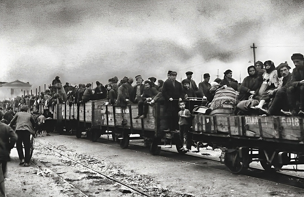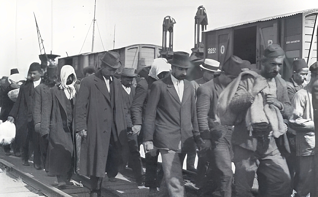 Samsun Refugees at Patras, Greece, starting for the Interior. Many of these Asia Minor refugees from the Black Sea port have found work among the currant vineyards and olive groves of the Peloponnesus, of which Patras, fourth city of Greece, is the chief seaport. Source: The National Geographic Magazine, Nov 1925, p. 568.